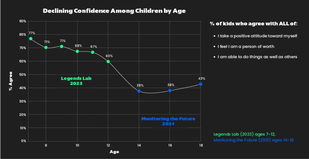 Hark’s ‘Listen Up Report’ raises the concern of a growing ‘confidence crisis‘ in our young people, reporting a statistic that, based upon their own studies, ‘1 in 3 young people have little or no confidence‘. This can be seen in a recurring phenomenon coined as ‘The Confidence Cliff‘ (see left). Brian Burkhard writes that ‘generally, kids are pretty confident until age 7 or 8, at which point there’s a decline in confidence… particularly among girls’. In a world dominated by perfectionism heightened by the popularity and success contest of social media, this trend is unfortunate, but not surprising. Hark’s report quotes Tom Campbell’s observation that ‘in schools this is stifling engagement, participation, freedom of expression and the opportunity to experiment with identity’.